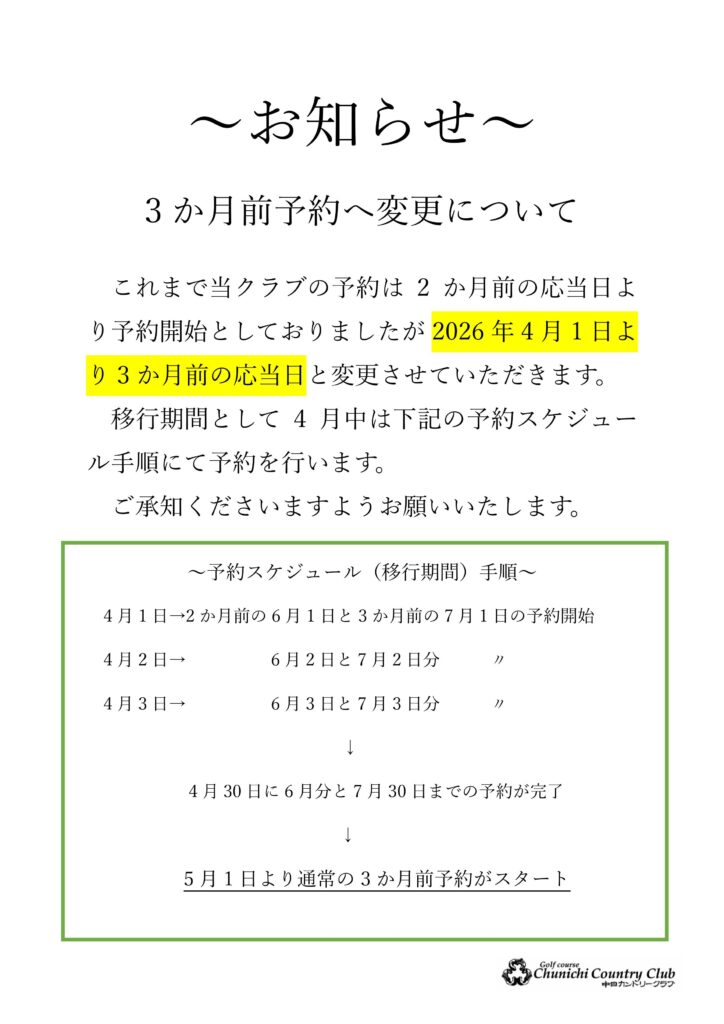 お知らせ【3か月前予約へ変更について】